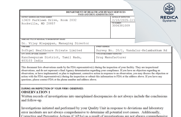SOFTGEL HEALTHCARE PRIVATE LIMITED - Form 483, 2025-02-14